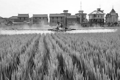 日前,一台大型机械在浙江省杭州市萧山区党湾镇梅东村省级粮食功能区内喷洒农药。据了解,这台被称为田间管理器的大型机械张开两侧“翅膀”时长达16米,“翅膀”上共有32只喷头可同时喷洒农药,一小时能喷50多亩,效率比现在普遍使用的背负式机动喷雾器提高了8倍左右。 王啸虎 葛亚琪 摄 |