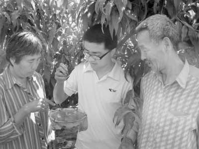 7月1日,新疆生产建设兵团第八师一四三团十八连果农王怀富夫妇和石河子大学农学院植保系下乡实习的大学生一起,在蟠桃园观察运用“性诱剂”生物防治病虫害的情况。 据了解,用“性诱剂”防治病虫害,不仅降低了生产成本,而且防治病虫害效果好,还能提高果品品质。今年该团万亩蟠桃园全都推广应用了“性诱剂”生物防治病虫害这一新技术。 王仁斯 摄 |
